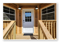 a night time picture of our cabins and the porches that overhang our stocked pond