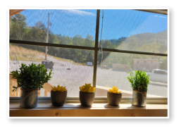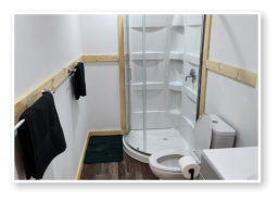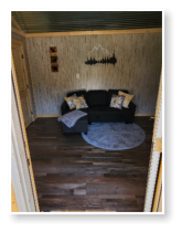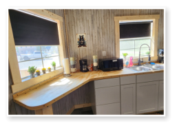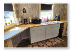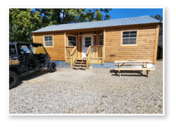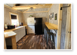 LiL Tackett Cabin (Sleeps 2-4)  •	Queen Bed & Queen Pull Out Couch  •	Bathroom With Full Shower and Linens •	TV •	Kitchen  •	Air Fryer •	Griddle •	Toaster •	Coffee Maker •	Microwave •	Refrigerator •	All Utensils
